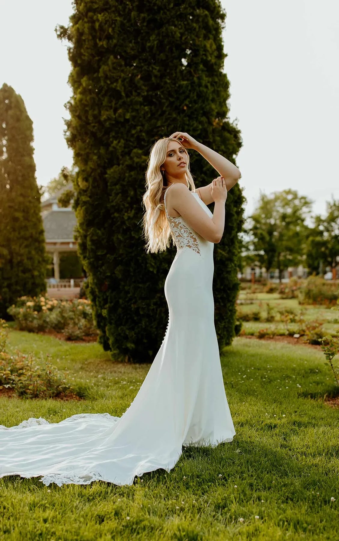 Stella York 7664 is a modern crepe sheath wedding dress featuring a detailed lace back, mirrored in the lace train! This gown comes to us in good condition from a designer boutique. The straps need cleaned. Stella York 7664 is Ivory/Porcelain in color and a size 16.