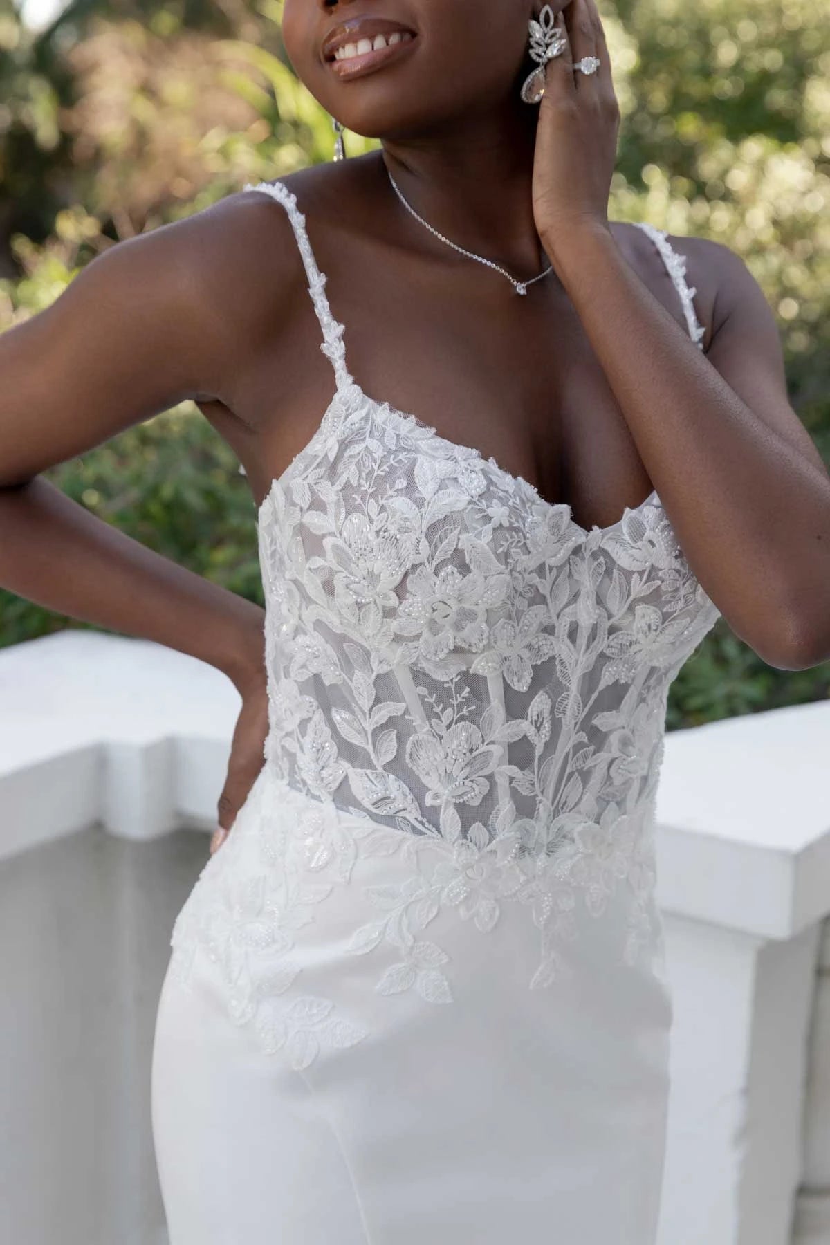 Stella York 7743 is an elegant satin fit and flare wedding dress featuring a lace bodice! This gown comes to us in good condition from a designer boutique. There are spots on the lining. Stella York 7743 is Ivory in color and a size 14.
