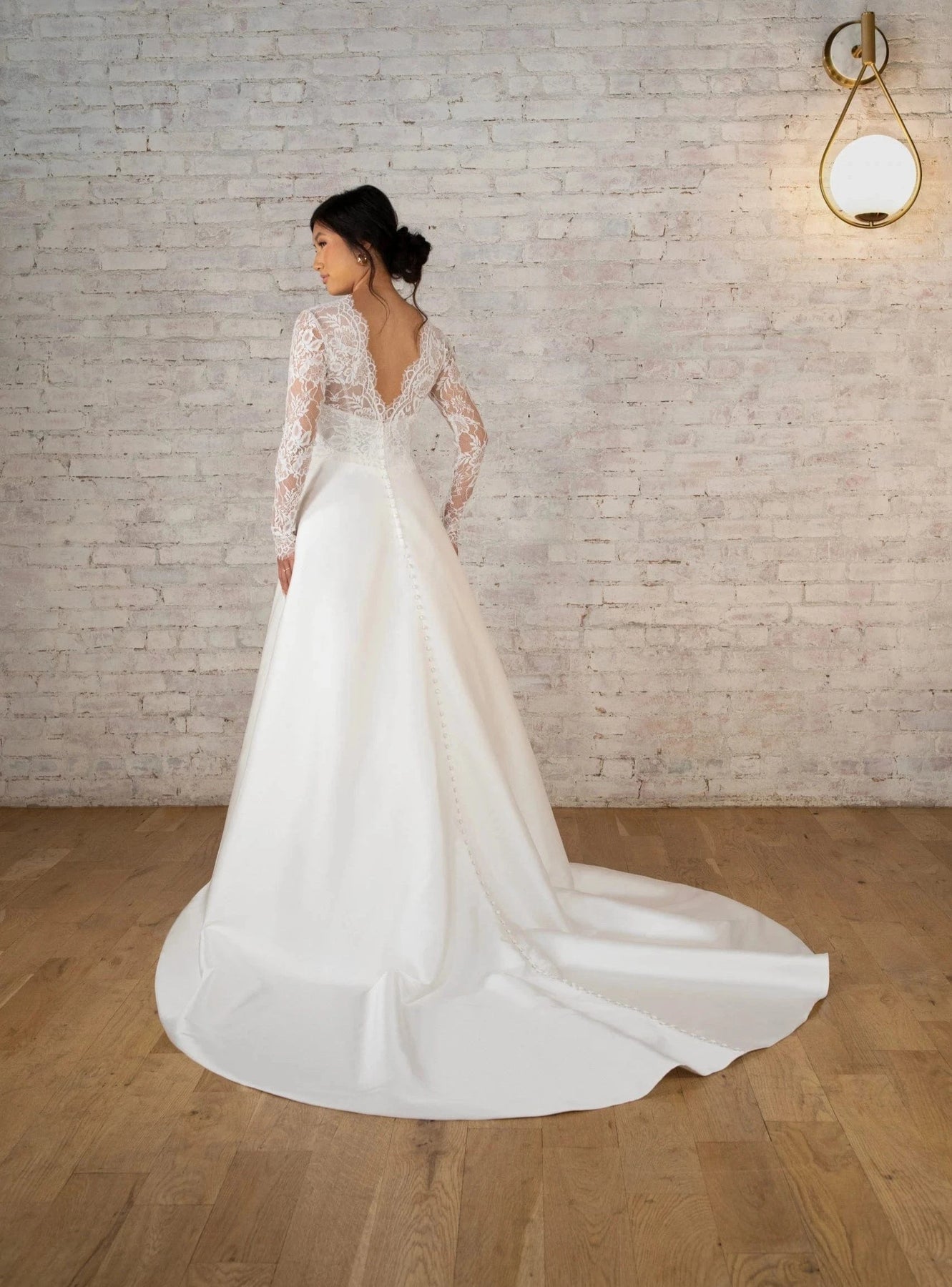 Stella York 7820 is a classic mikado A-line wedding dress with a V neckline + sheer long lace sleeves! This gown comes to us in great condition from a designer boutique. Stella York 7820 is Ivory/Porcelain in color and a size 14.