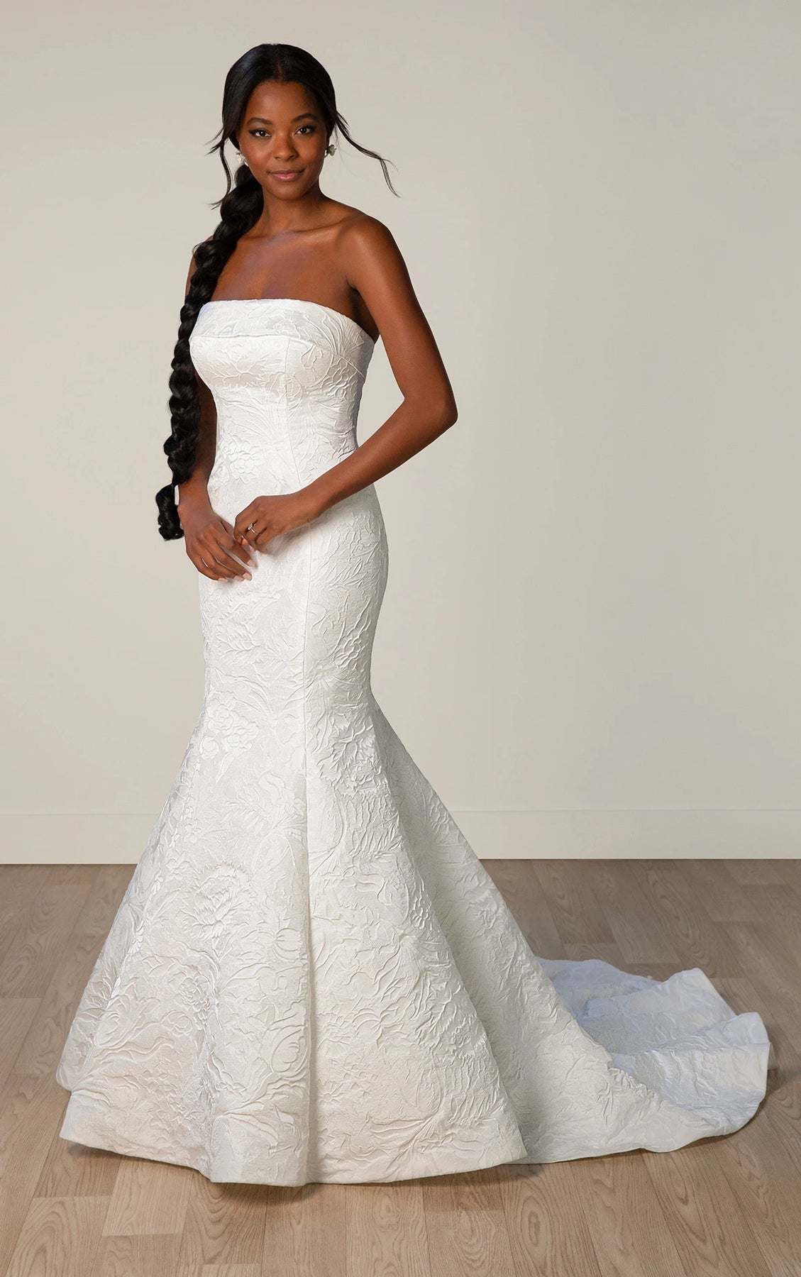 Stella York 8011 is a modern satin jacquard fit and flare wedding dress featuring a straight banded neckline! This gown comes to us in great condition from a designer boutique. Stella York 8011 is Ivory in color and a size 28.