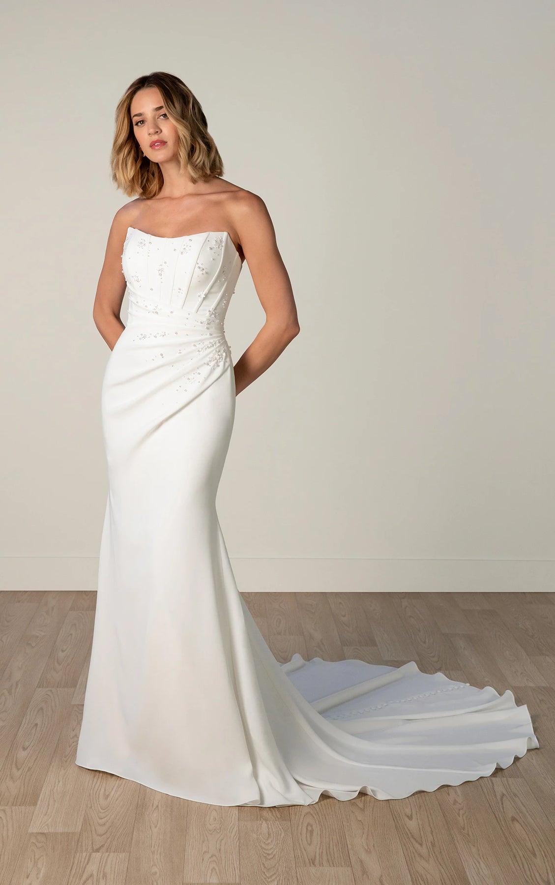 Stella York 8056 is a modern crepe fit and flare wedding dress featuring a strapless scoop neckline + a flowy train! This gown comes to us in good condition from a designer boutique. There are loose beads, + the underarms needs cleaned. Stella York 8056 is Ivory in color and a size 14.