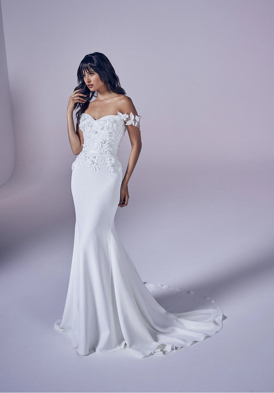 Suzanne Neville Romance is a glamorous crepe fit and flare wedding dress featuring dimensional floral accents! This gown comes to us in good condition from a designer boutique. There is boutique dust on the train. Suzanne Neville Romance is Off White in color and a size 14.