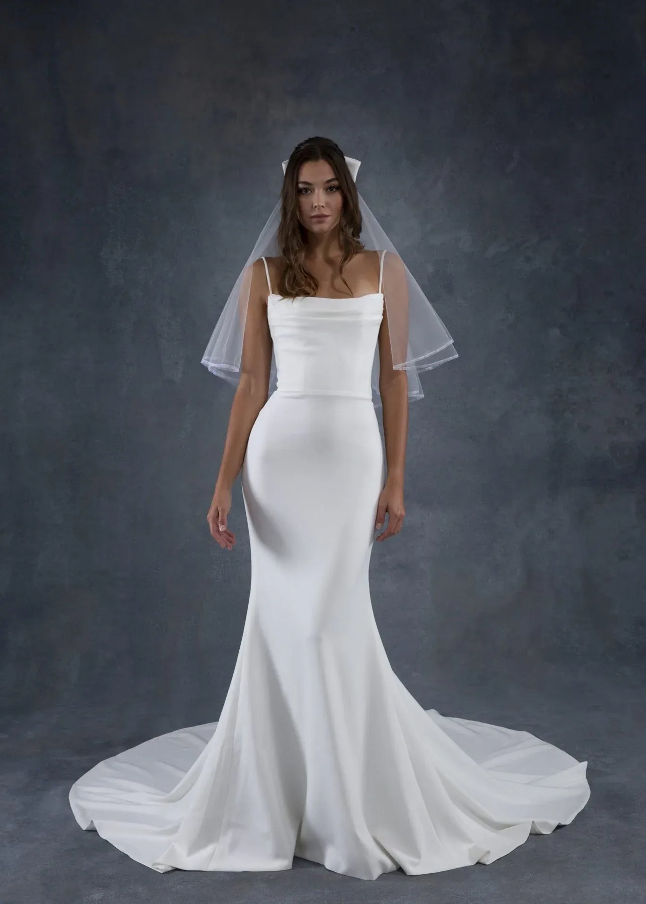 Tara Lauren Laguna is a modern crepe fit and flare wedding dress featuring off-the-shoulder straps + spaghetti straps for two different looks! This gown comes to us in good condition from a designer boutique. There are spots on the lining. Tara Lauren Laguna is Ivory in color and a size 8.
