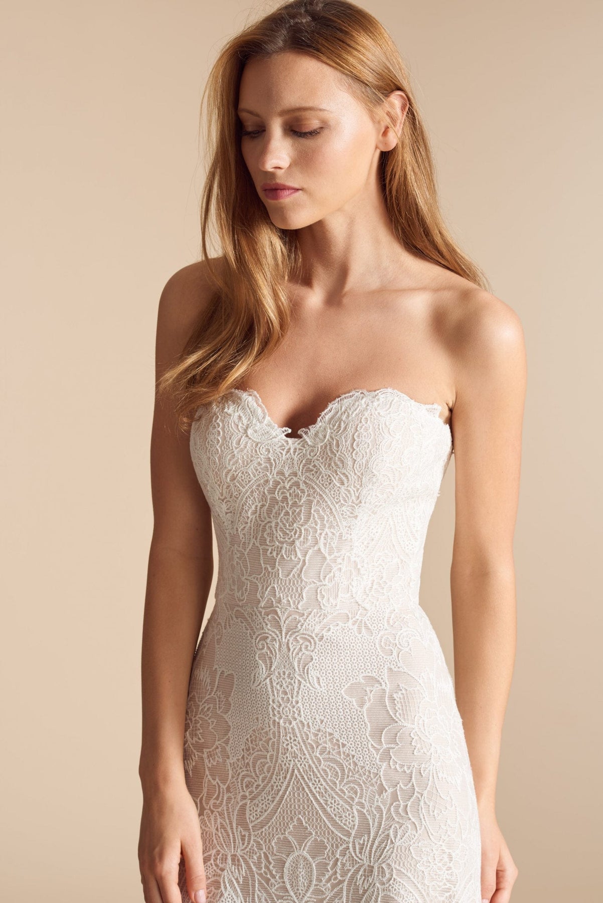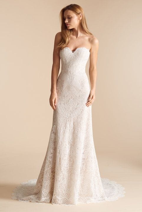 Ti Adora 7801 is a stunning lace sheath wedding dress featuring a strapless sweetheart neckline! This gown comes to us in good condition from a designer boutique. The eye is missing. Ti Adora 7801 is Ivory/Cashmere in color and a size 4.