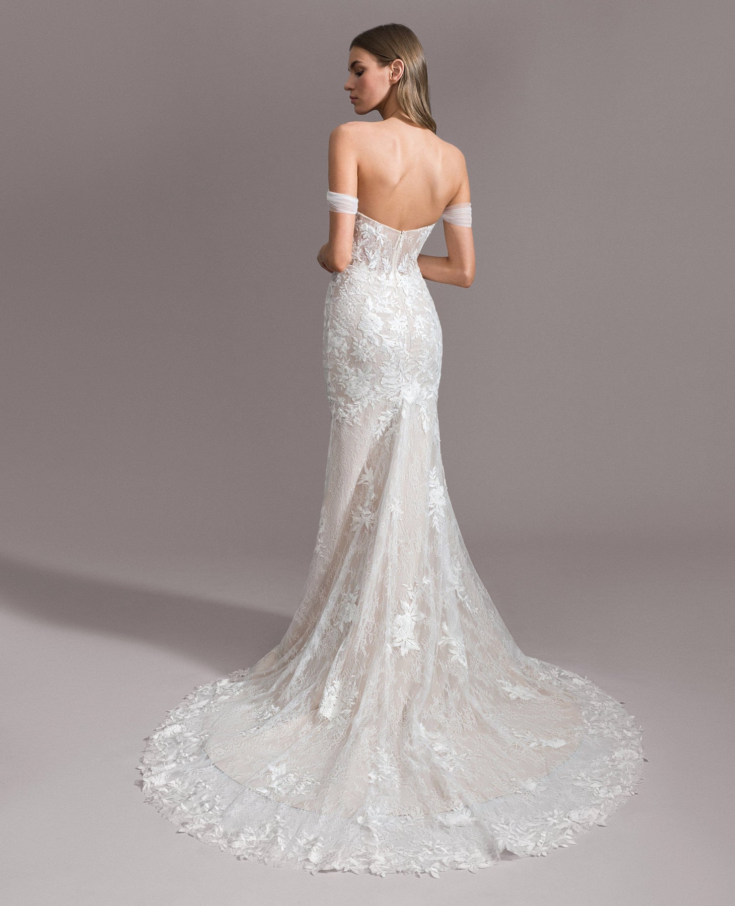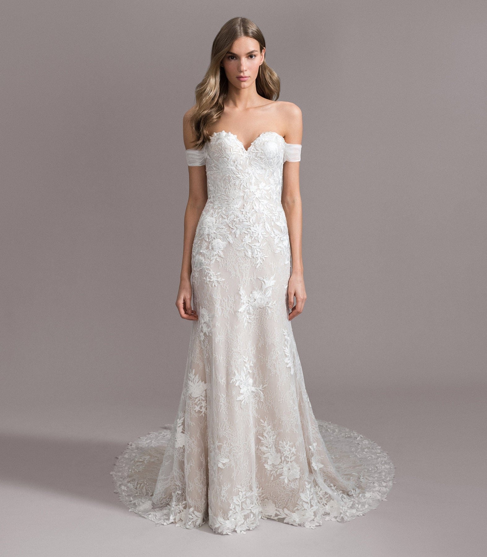 Ti Adora Ivy is a romantic lace fit and flare wedding dress! This lovely look features a deep sweetheart neckline, strapless bodice, + long sheer train. This gown comes to us in good condition from a designer boutique. There are loose threads, + loose pieces of lace. Ti Adora Ivy is Ivory in color and a size 10.