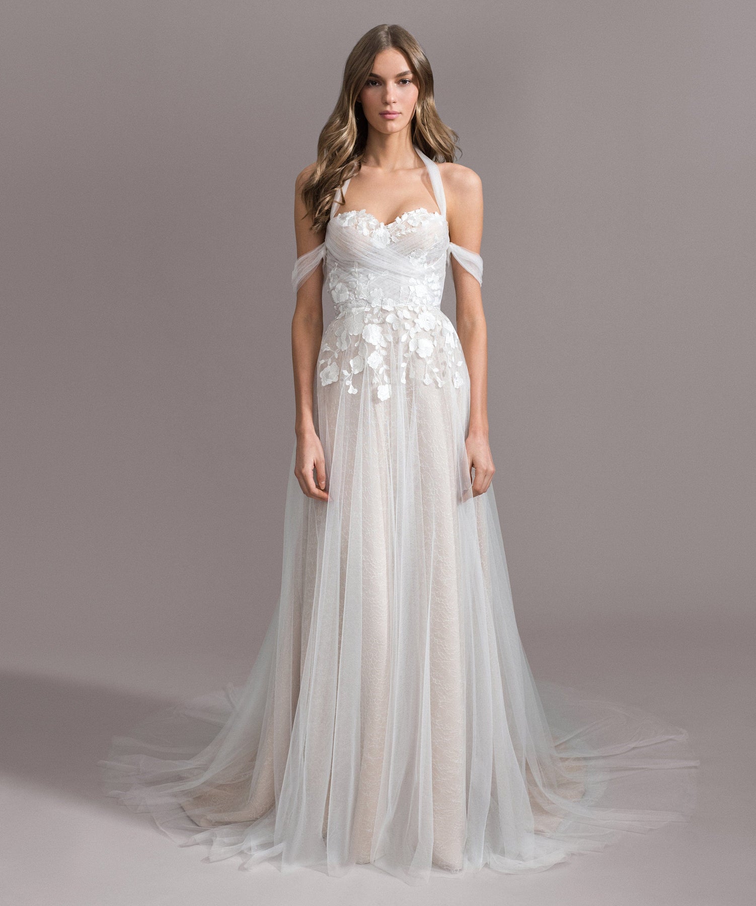 Ti Adora Zoe 7959 is a lovely tulle A-line wedding dress featuring dimensional lace accents! This gown comes to us in good condition from a designer boutique. A cup needs resewn. Ti Adora Zoe 7959 is Ivory/Cashmere in color and a size 10.