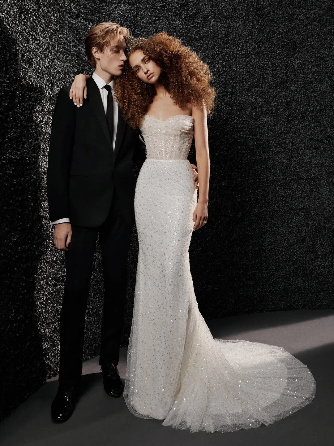 Vera Wang Bride Lilie is a dazzling gown of sequined tulle! The bustier-style bodice has a sweetheart neckline + visible boning. The slim skirt flows from the defined waistline into a short train! This gown comes to us in great condition from a designer boutique. Vera Wang Bride Lilie is Off White in color and a size 12.