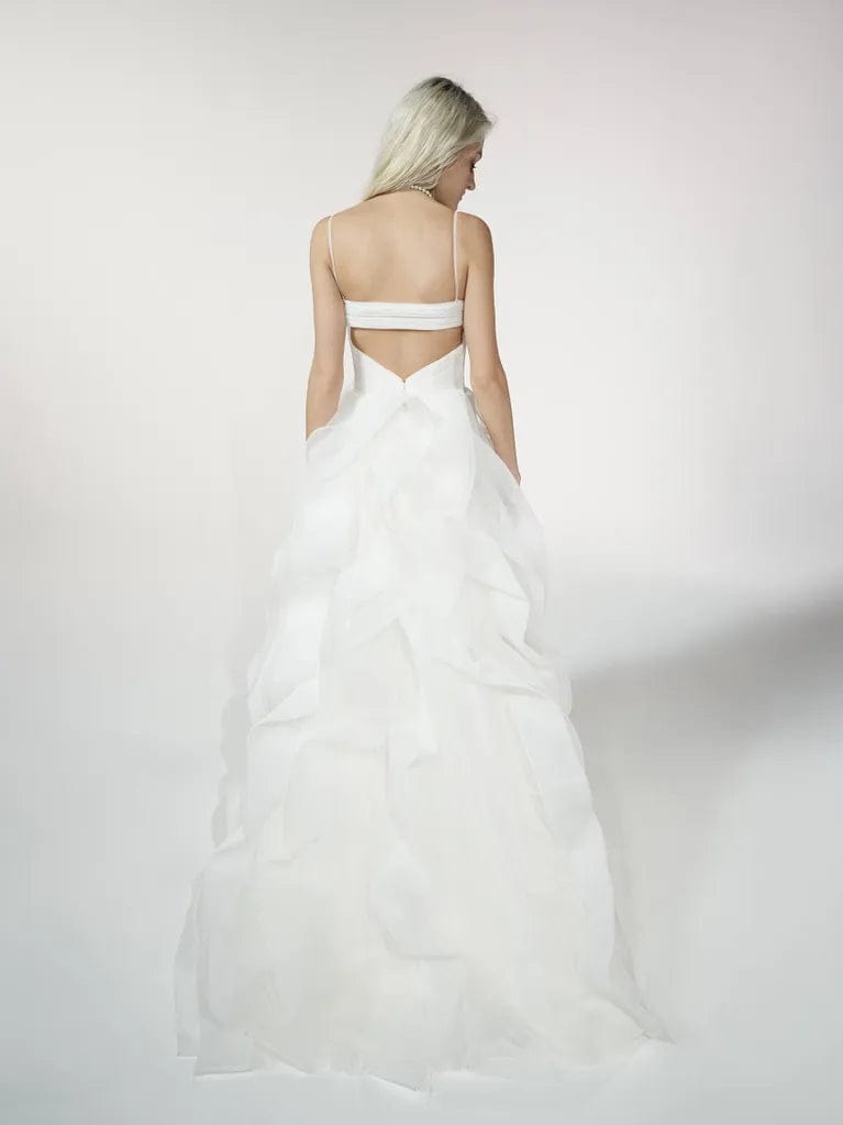 Vera Wang Bride Rubria is a flouncy tulle ball gown featuring tiered layers to create a dimensional skirt! The keyhole back adds a pop of detail. This gown comes to us in great condition from a designer boutique. Vera Wang Bride Rubria is Off White in color and a size 12.