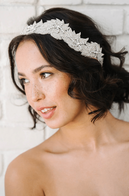 Sara Gabriel Vida Duet features hundreds of sparkling crystals + shimmering glass beads that are intricately hand-stitched into a stunning leaf-like pattern on this grand design.
