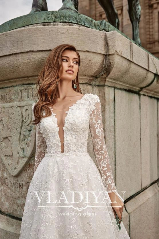 Vladiyan BF2003 is a glamorous lace A-line wedding dress featuring a deep V neckline + long sleeves! This gown comes to us in great condition from a designer boutique. Vladiyan BF2003 is White in color and a European size 38, which fits like a US size 6.