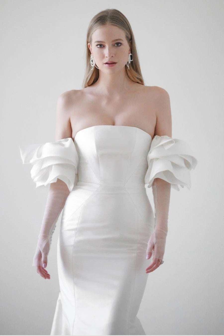 Watters Bunny 66334B is a striking satin fit and flare wedding dress featuring a straight neckline + detached puffed sleeves with sheer fingerless gloves! This gown comes to us in good condition from a designer boutique. Spot cleaning is needed. Watters Bunny 66334B is Ivory in color and a size 12.