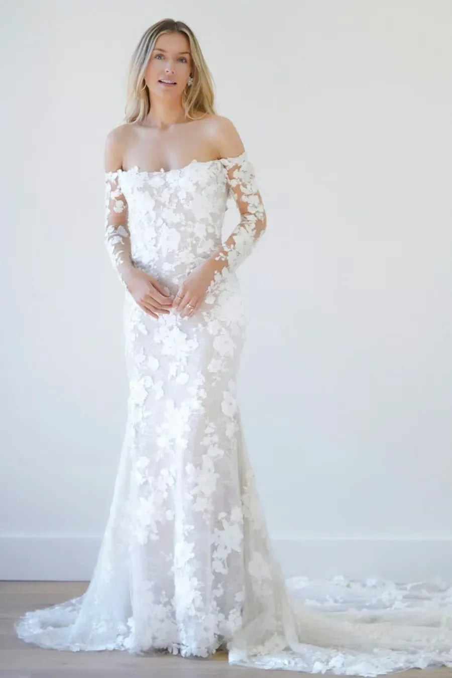 Watters Dream With Sleeves is a stunning lace fit and flare wedding dress with an off-the-shoulder long sleeve neckline + sheer back! This gown comes to us in good condition from a designer boutique. There are loose threads. Watters Dream With Sleeves is Ivory/Snow in color and a size 10.