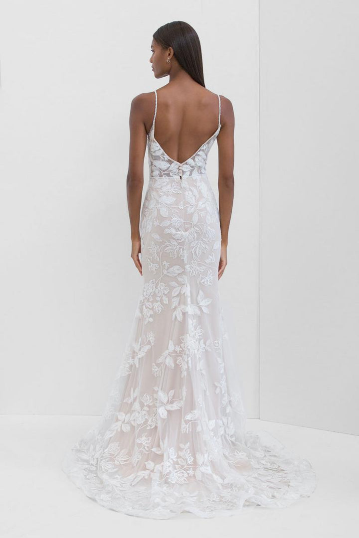 Watters Paloma is a chic tulle sheath wedding dress with all over lace applique + an illusion V neckline! This gown comes to us in great condition from a designer boutique. Watters Paloma is Ivory in color and a size 14.