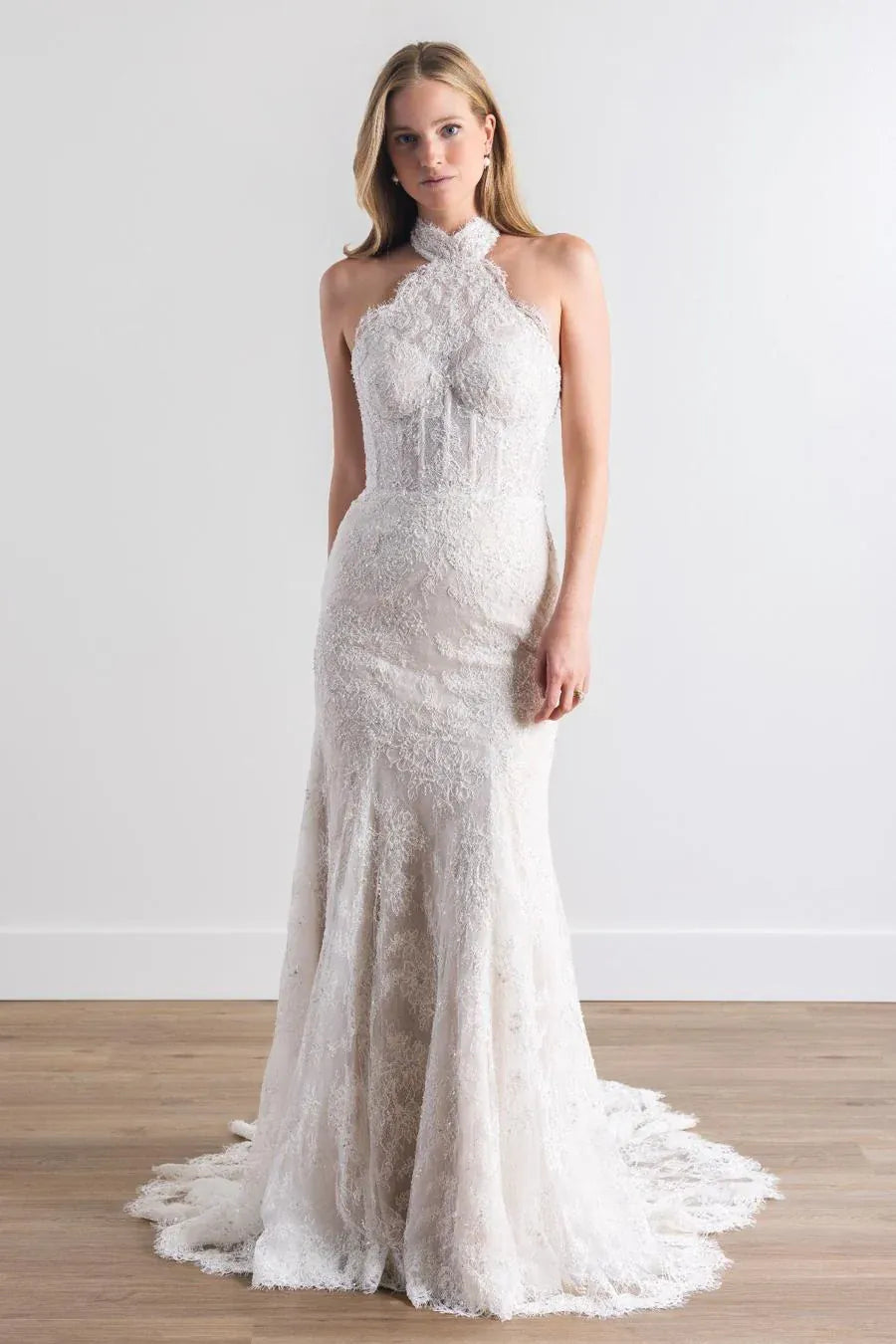 Watters Tate is a romantic lace sheath wedding dress featuring a halter-style neckline + floral motifs! This gown comes to us in great condition from a designer boutique. Watters Tate is Ivory/Blush in color and a size 14.