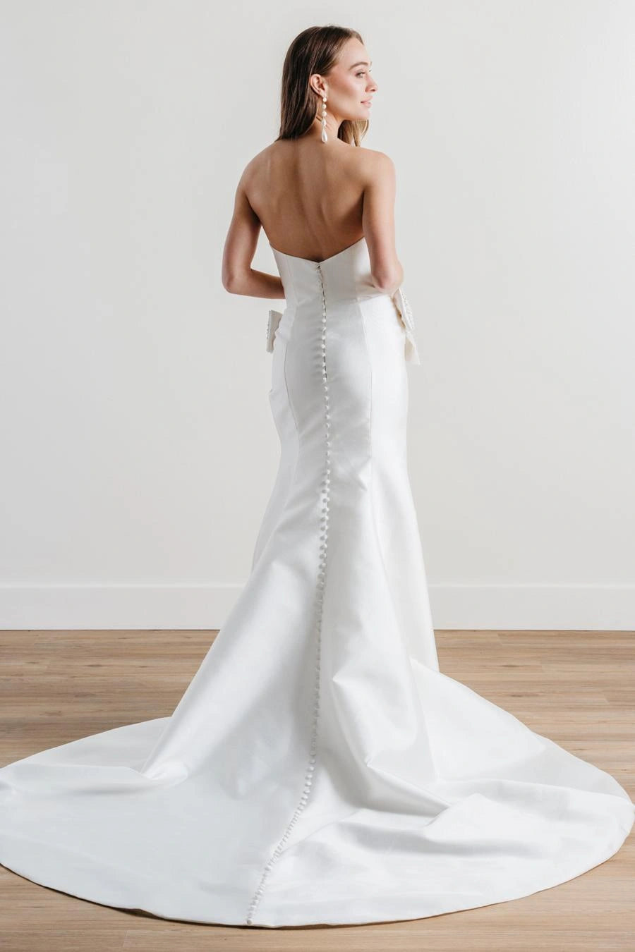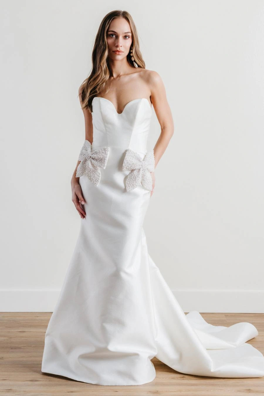 WTOO Classic is a modern mikado fit and flare wedding dress featuring detachable beaded bows! This gown comes to us in good condition from a designer boutique. There are small spots on the front. WTOO Classic + Bows is Ivory in color and a size 2.
