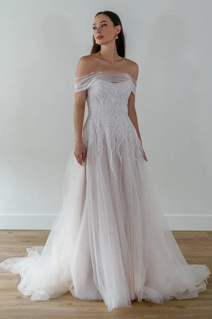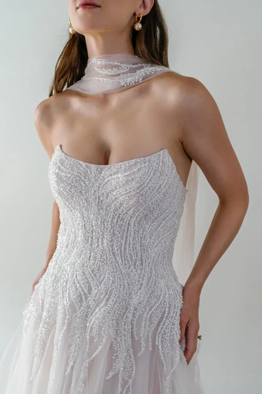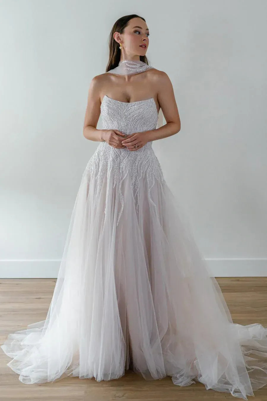 Locket by Watters [formerly Wtoo] Dazzle is a pretty tulle A-line wedding dress featuring cascading beading on the bodice + a detachable topper! This gown comes to us in good condition from a designer boutique. There are loose beads + appliqué. Locket by Watters Dazzle + Topper is Moscato in color and a size 10.