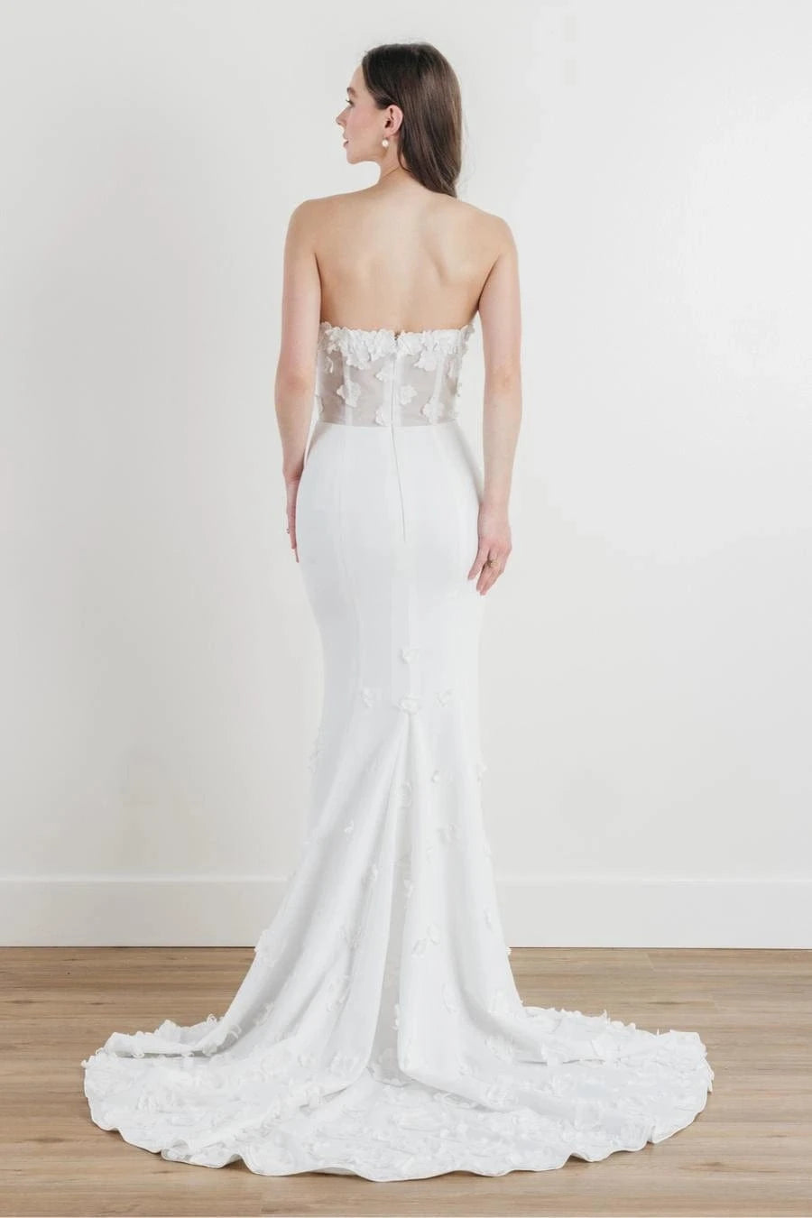 WTOO Malia 13137 is a gorgeous crepe fit and flare wedding dress featuring dimensional floral accents on the bodice + skirt! This gown comes to us in good condition from a designer boutique. There is a spot on the front + on the back. WTOO Malia 13137 is Ivory in color and a size 8.