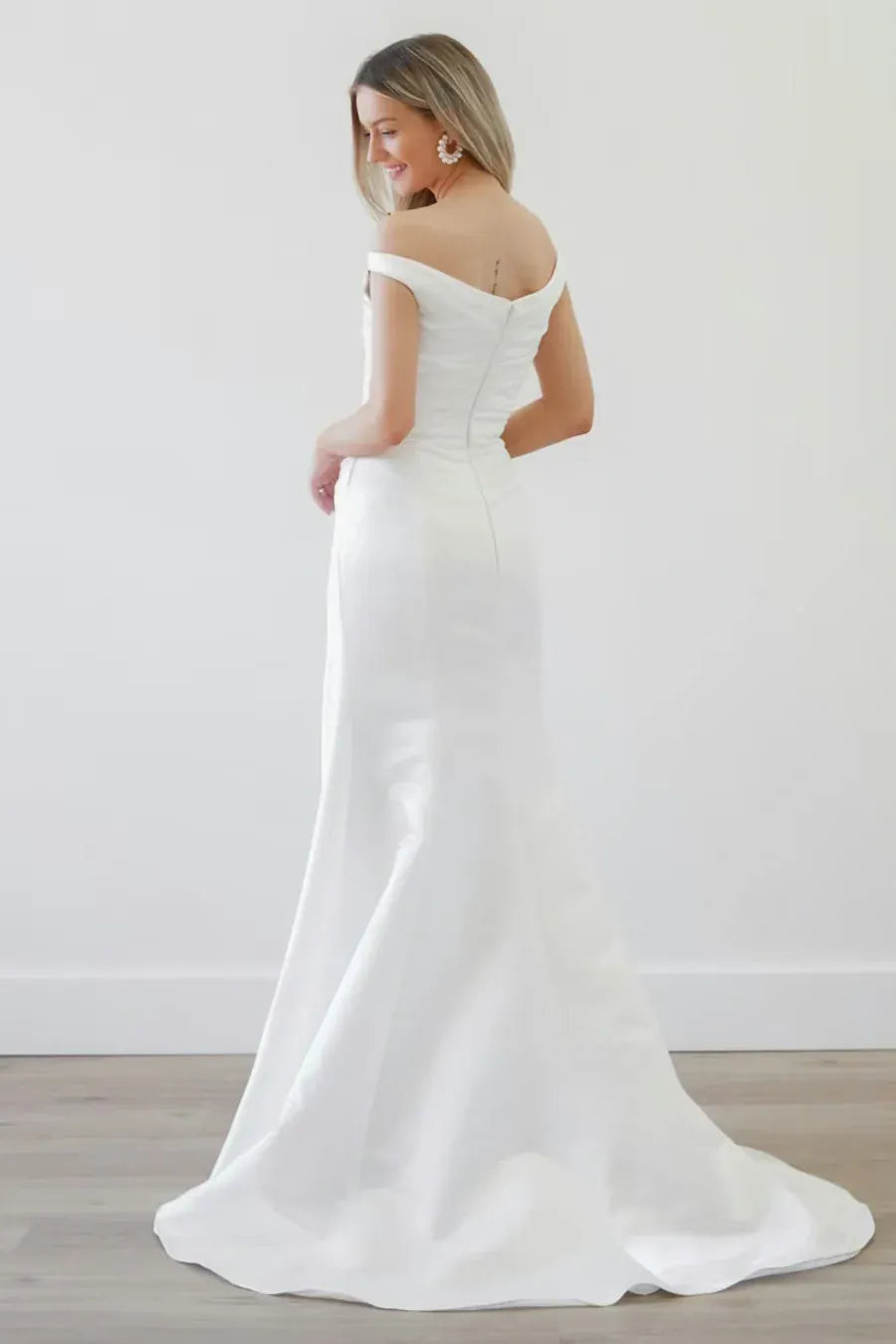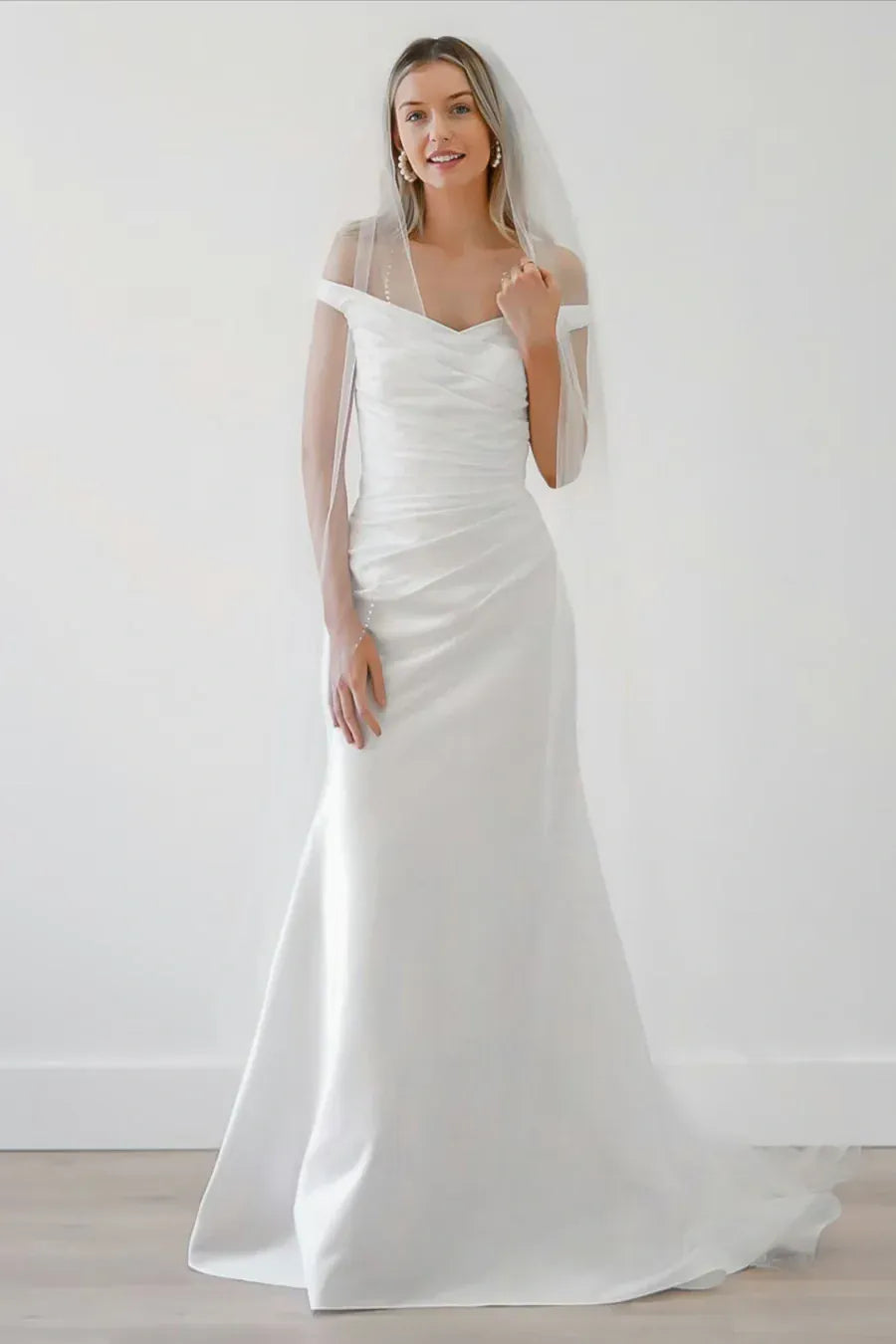 March is a gorgeous satin sheath wedding dress featuring an off-the-shoulder neckline! This gown comes to us in great condition from a designer boutique. Locket by Watters March is Ivory in color and a size 12.
