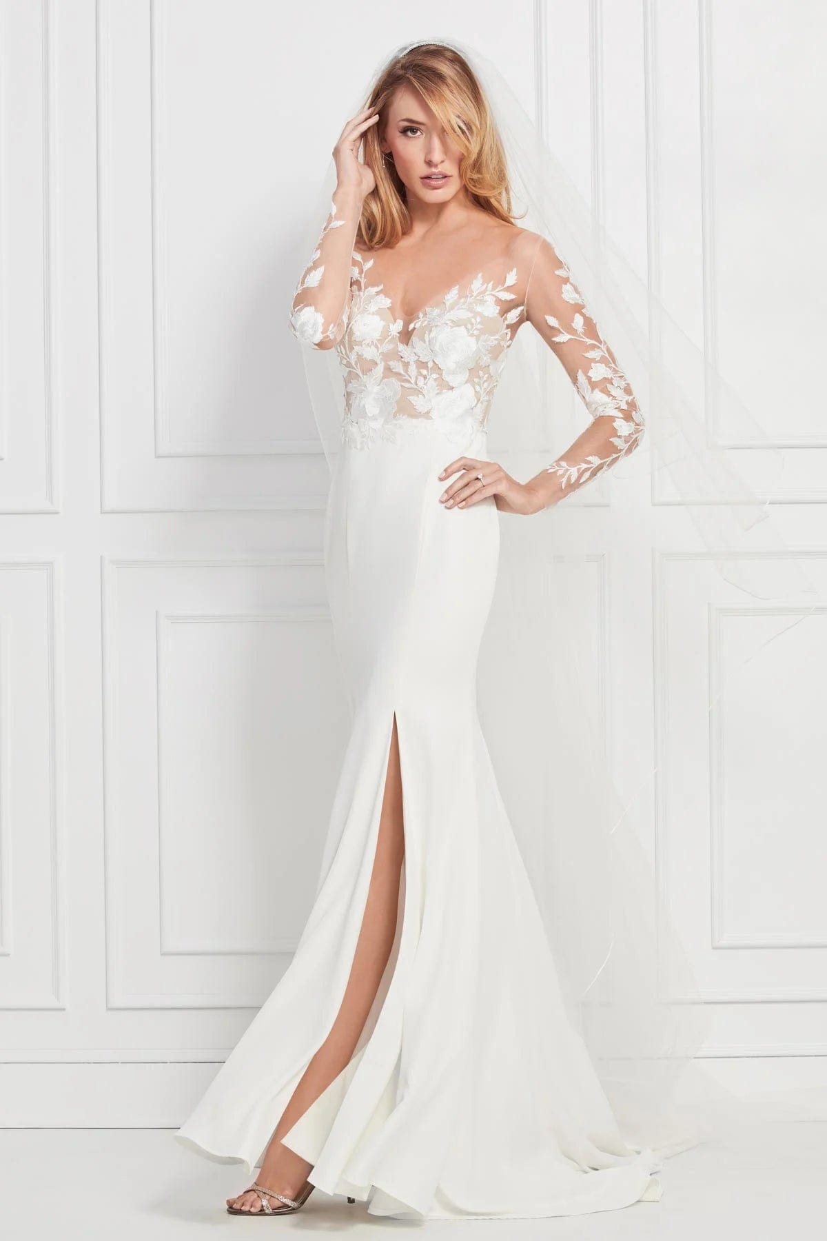 WTOO Rylan is a chic crepe fit and flare wedding dress! Dreamy lace motifs adorn the V neck bodice + sheer sleeves. This gown comes to us in great condition from a designer boutique. WTOO Rylan is Ivory in color and a size 18W.
