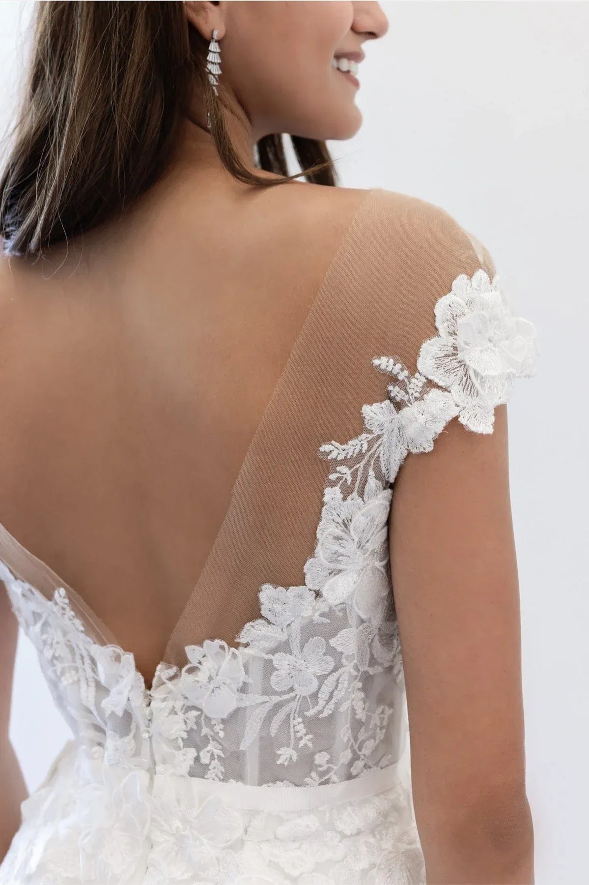 WTOO Sunaina 10714 is a beautiful tulle A-line wedding dress featuring floral details throughout! The illusion neckline has cap sleeves for added detail. This gown comes to us in great condition from a designer boutique. WTOO Sunaina 10714 is Ivory/Nude in color and a size 8.